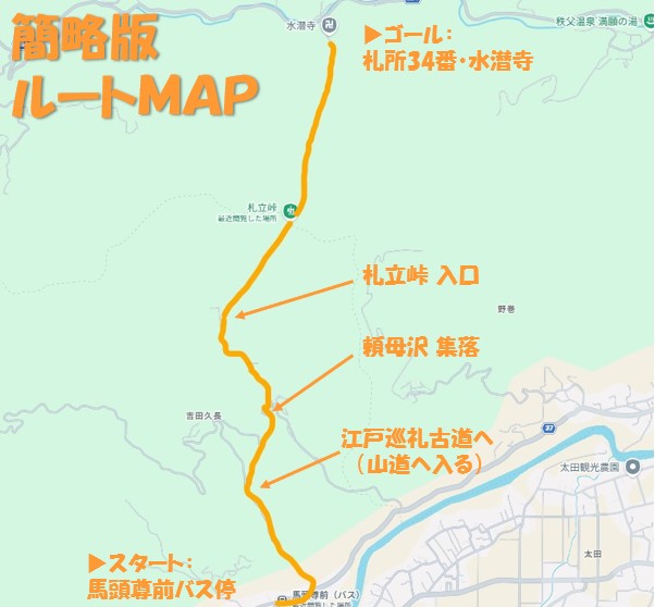 簡単な地図も掲載しておきます。あくまで簡略化したものとなります。特に札立峠の入口~札立峠~水潜寺のルートは以下の画像のように直線的ではありませんのでご注意ください。