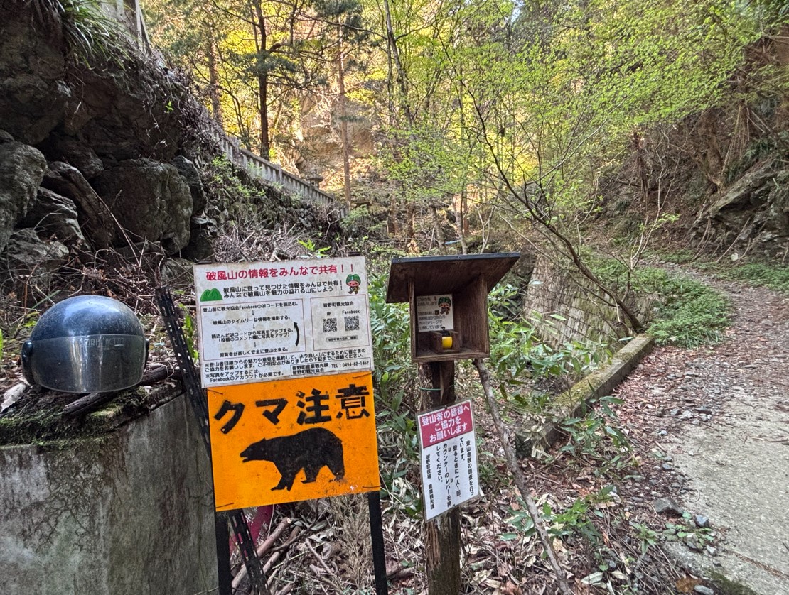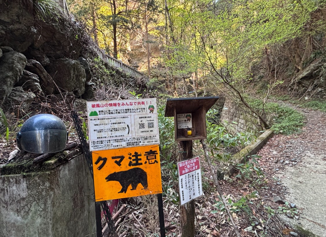 熊出没注意の看板が強いインパクトを与えます。この看板を見ると引き返したくなる人もいるのではないでしょうか。でも、もうここまで来たら後戻りはできません!ここから約1時間30分の峠越えが始まります!