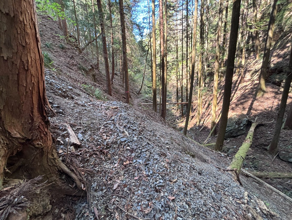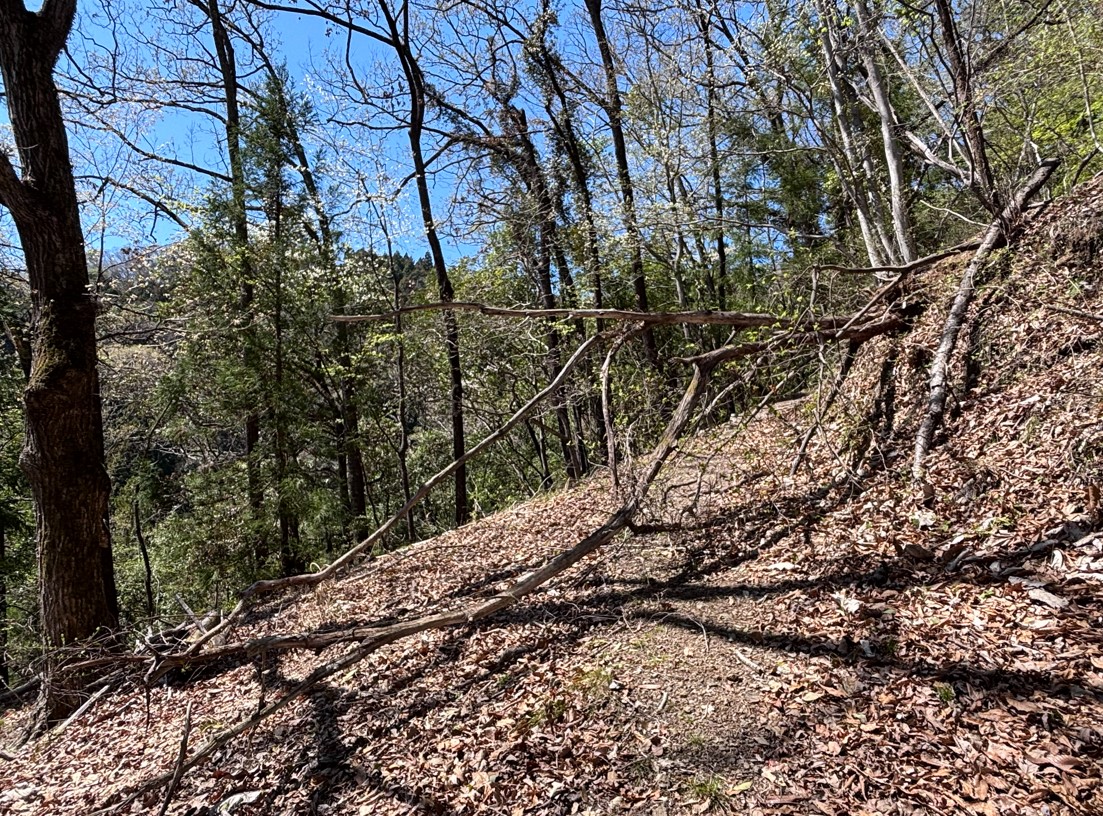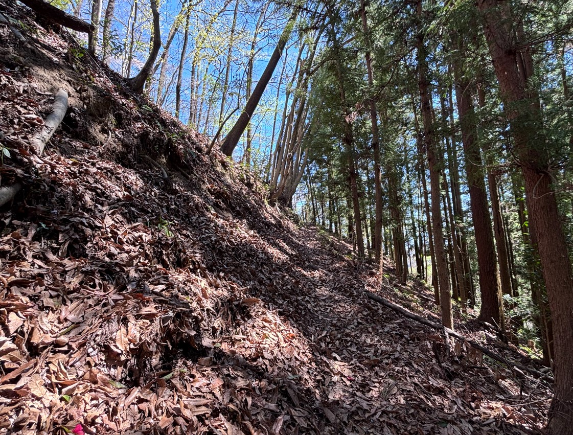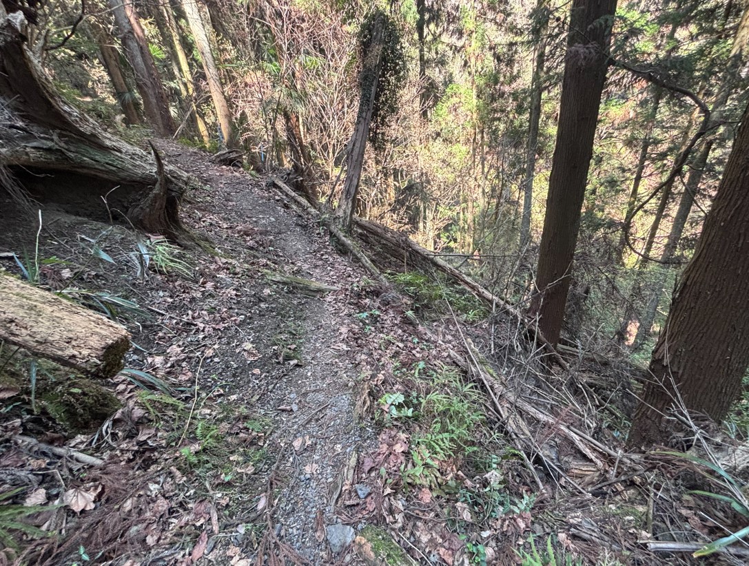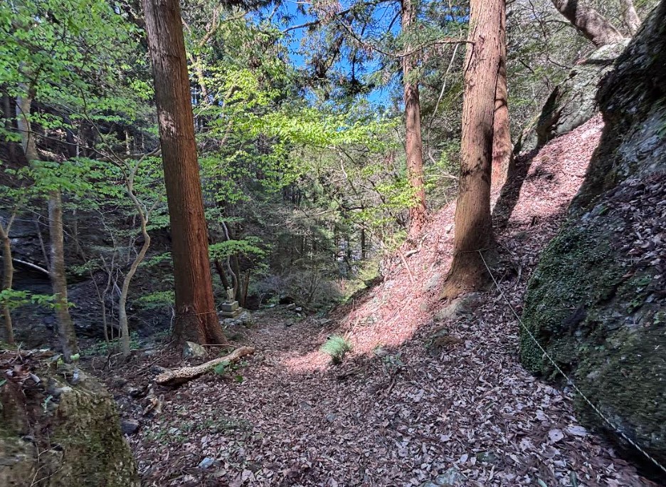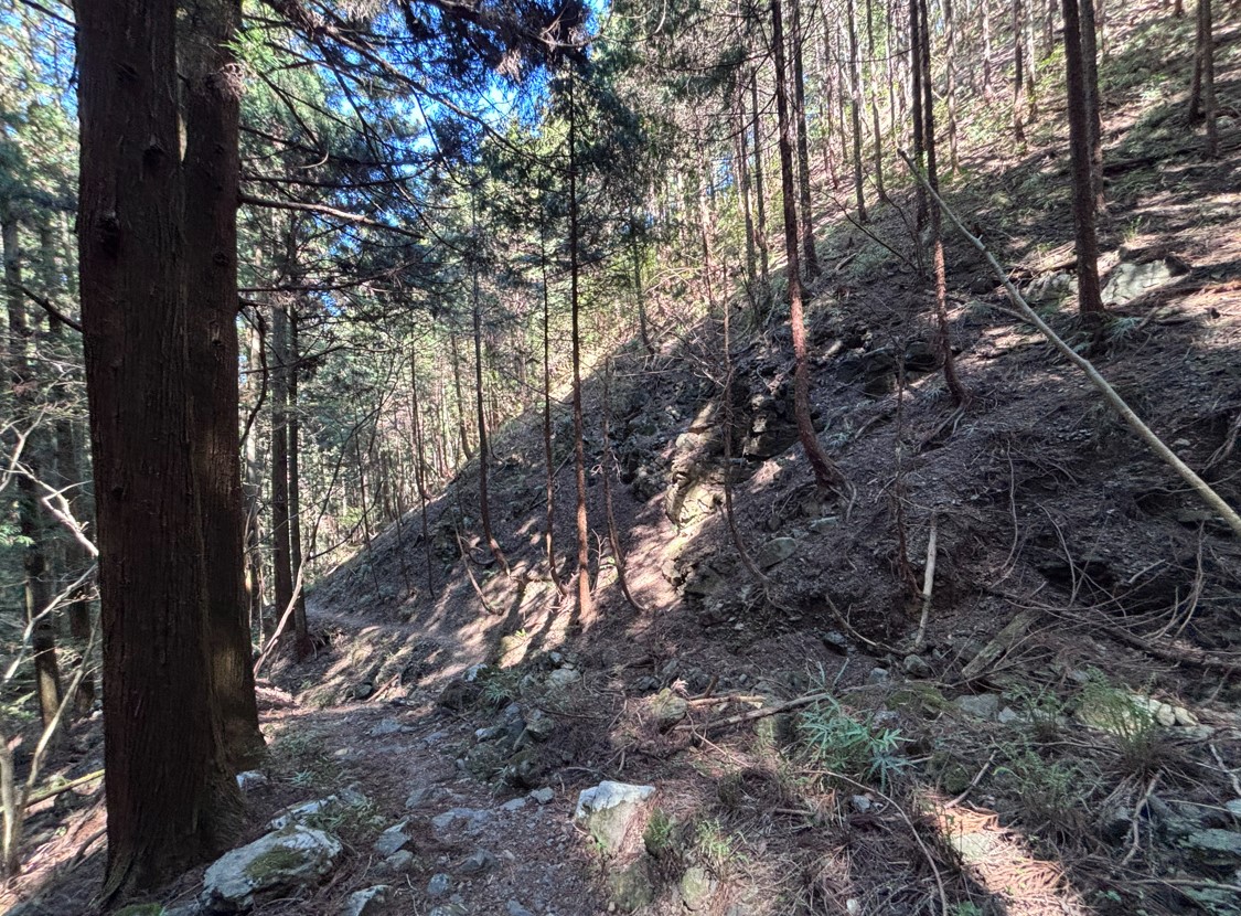 急な斜面に加えて、大量の落ち葉。足元に注意が必要です。こんな道が続くからこそ、トレッキングポールや運動靴・登山靴が必要となります。