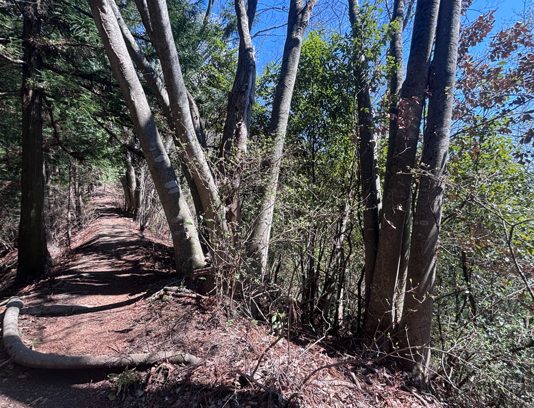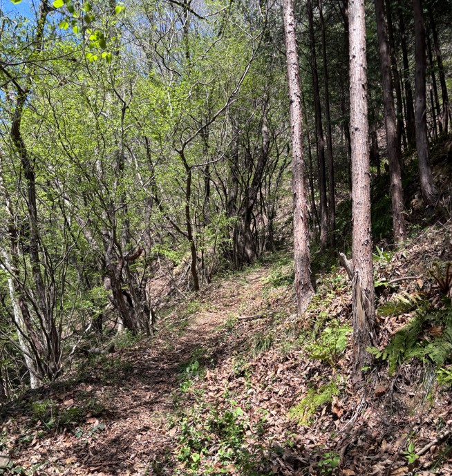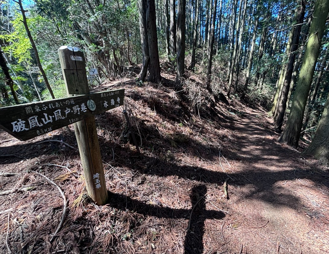 水潜寺付近は杉林の急な登りが続きますが、その一方で広葉樹林の穏やかな尾根道もあり、秩父の山々を眺めながら歩ける「皆野アルプス」の一部として人気があります。