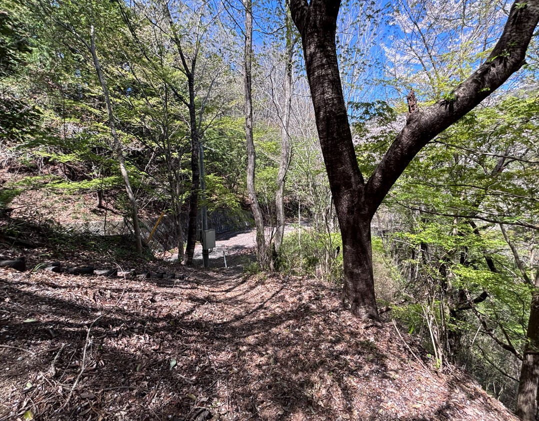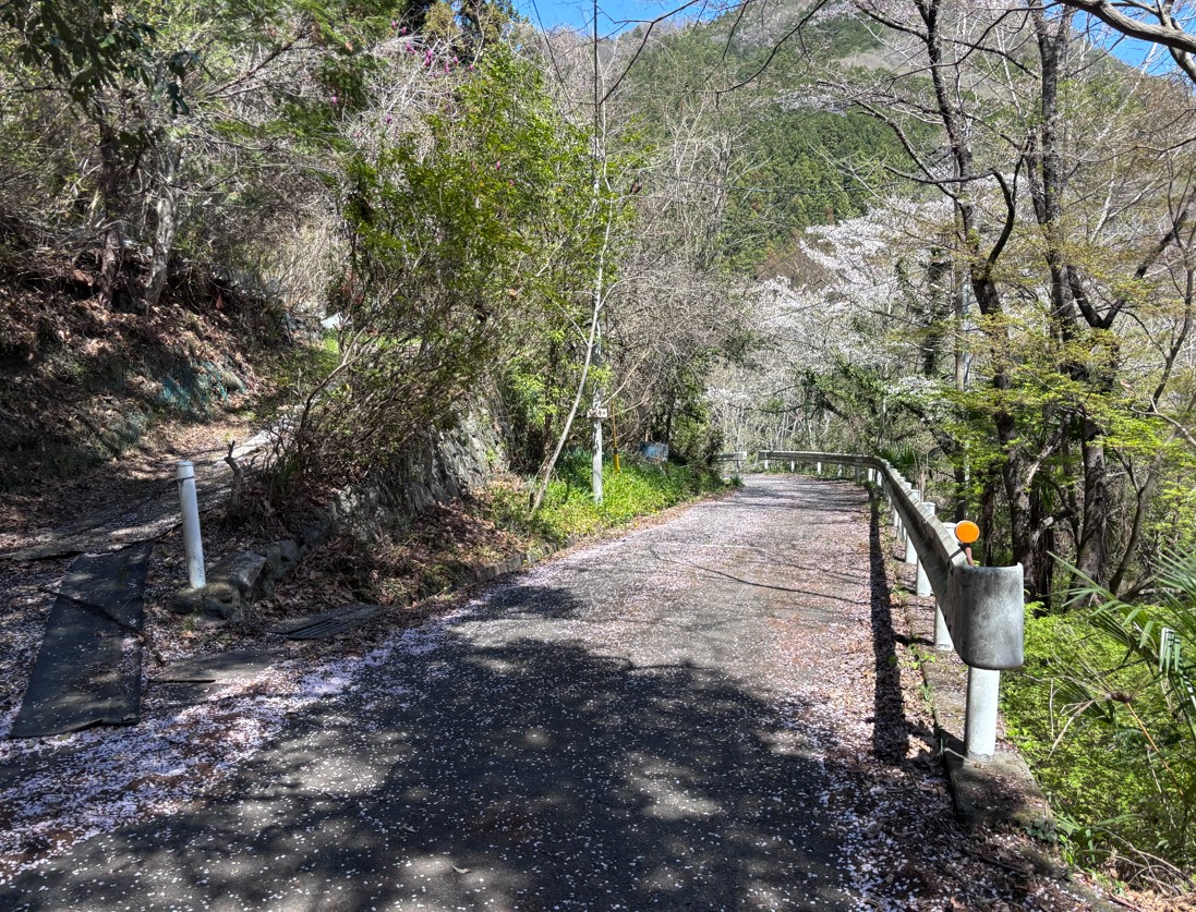 この坂道を下っていきます。撮影日は、桜の花びらが多く残る4月初旬。