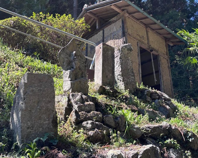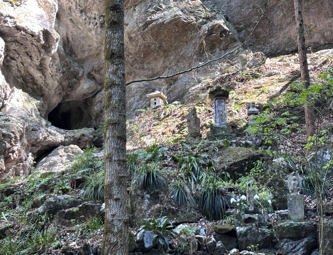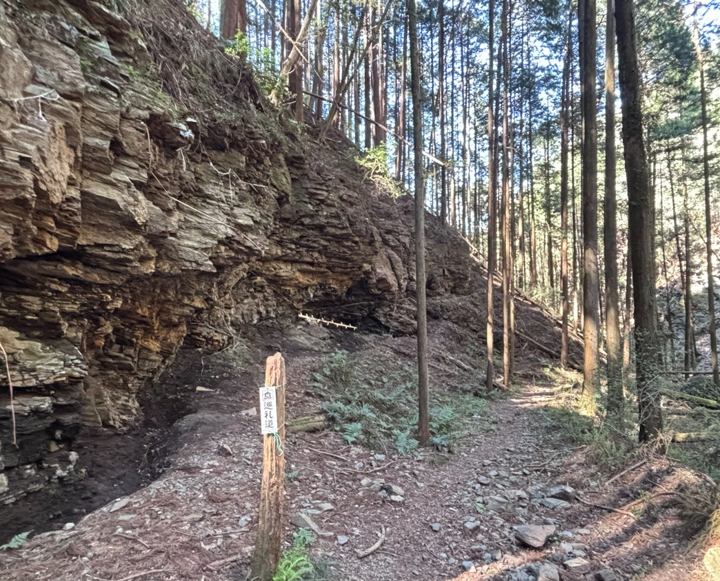 水潜りの岩屋が良く見えます。かつてはここに入って俗世へと戻る儀式を行っていたようですが、今では崩落による入ることはできません。洞窟の穴がよく見えるのはこのあたりなので、しっかりと見ておきましょう。