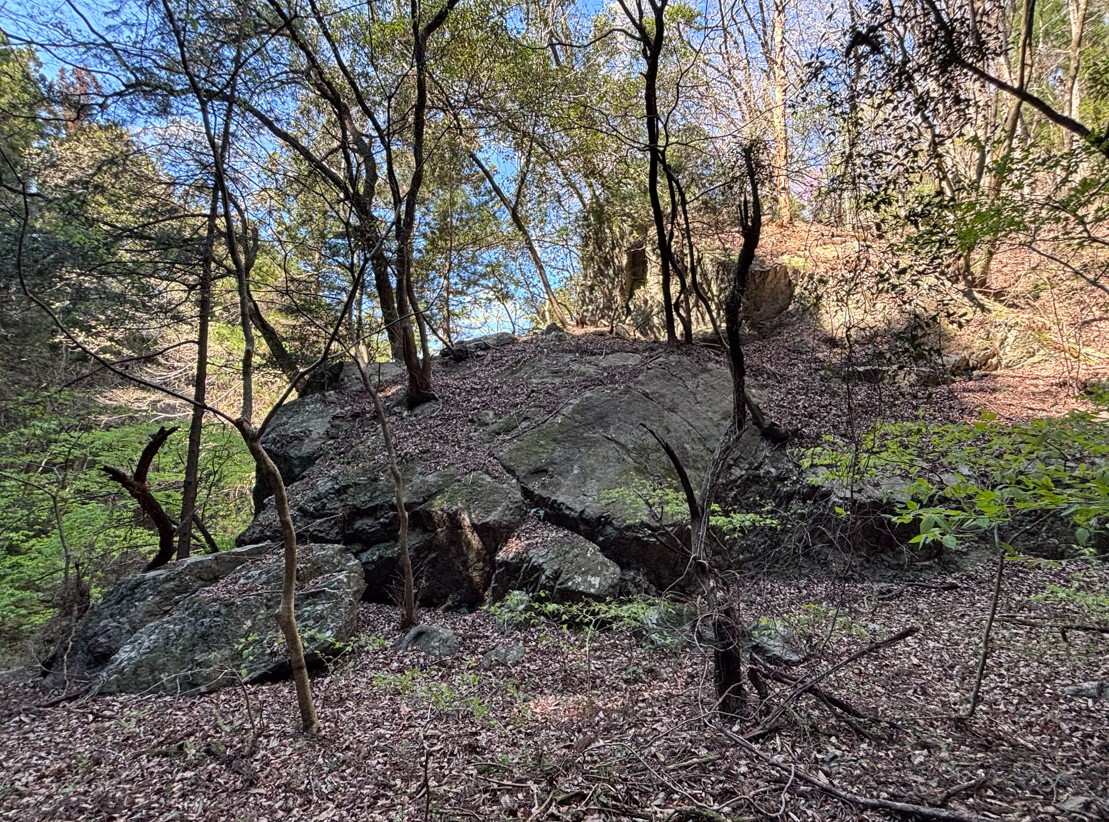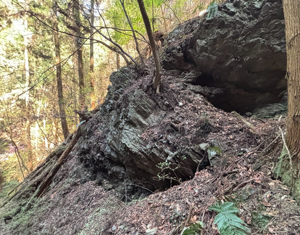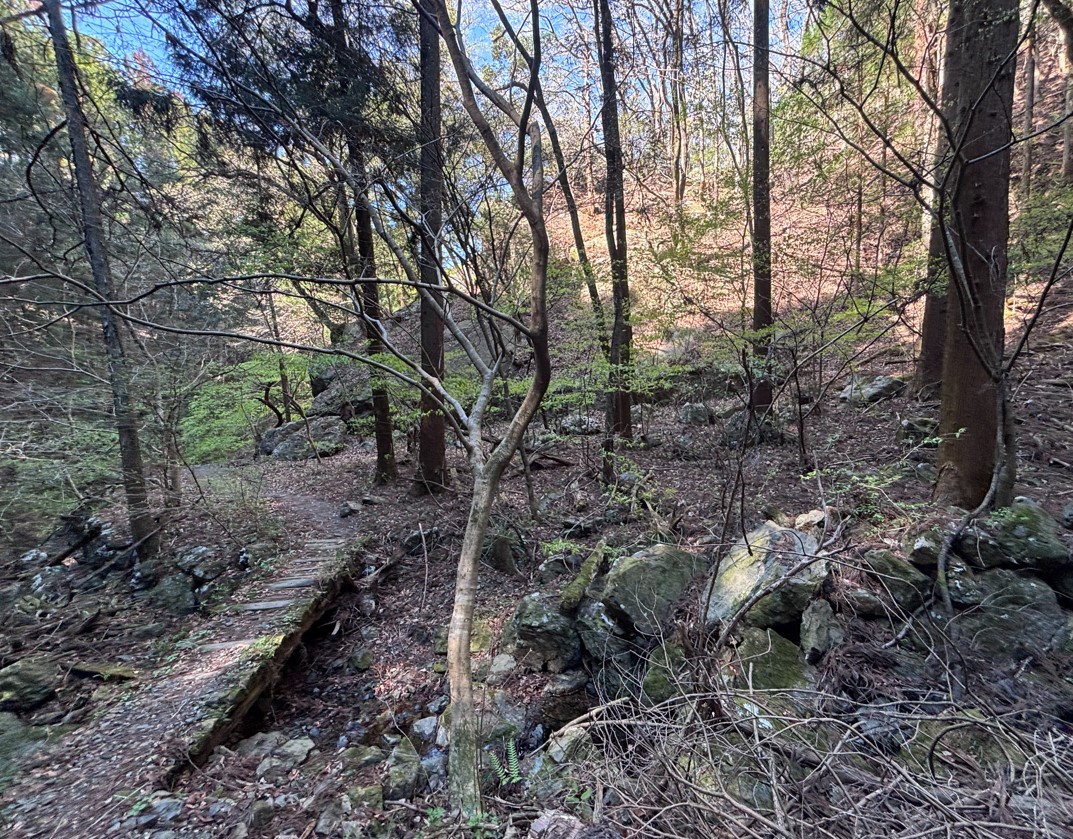 沢の近くには、古代の地層のような巨石が多くあります。