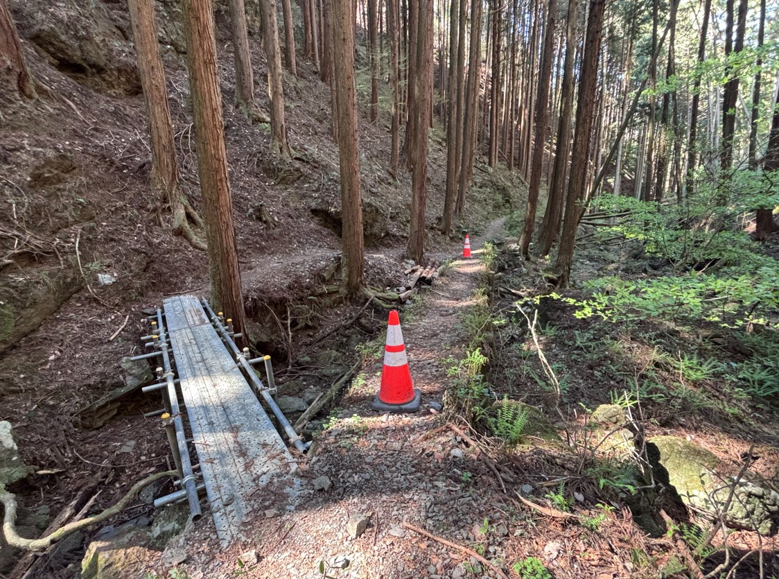 さらに、水潜寺へ近づくにつれて木板でできた橋も頻繁に現れます。中には金属製の即席の橋も。これは2026年の午年総開帳に合わて設置したものだろうか。