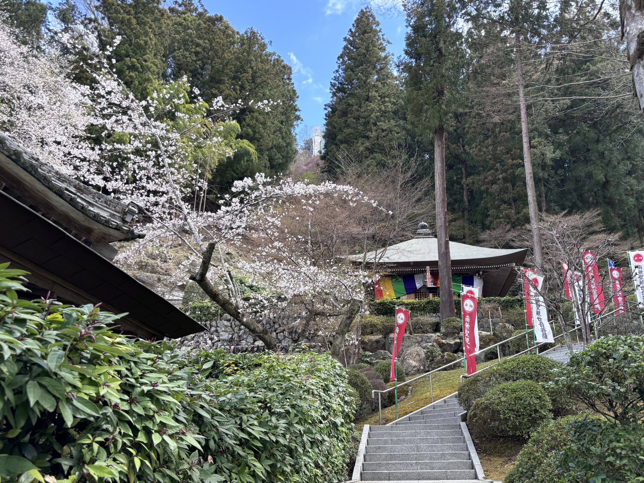 本堂から山の上を見上げると、巨大な護国観音像を拝むことができます。この場所へ行くには、本堂からは片道20分。往復で約40分の場所にあります。