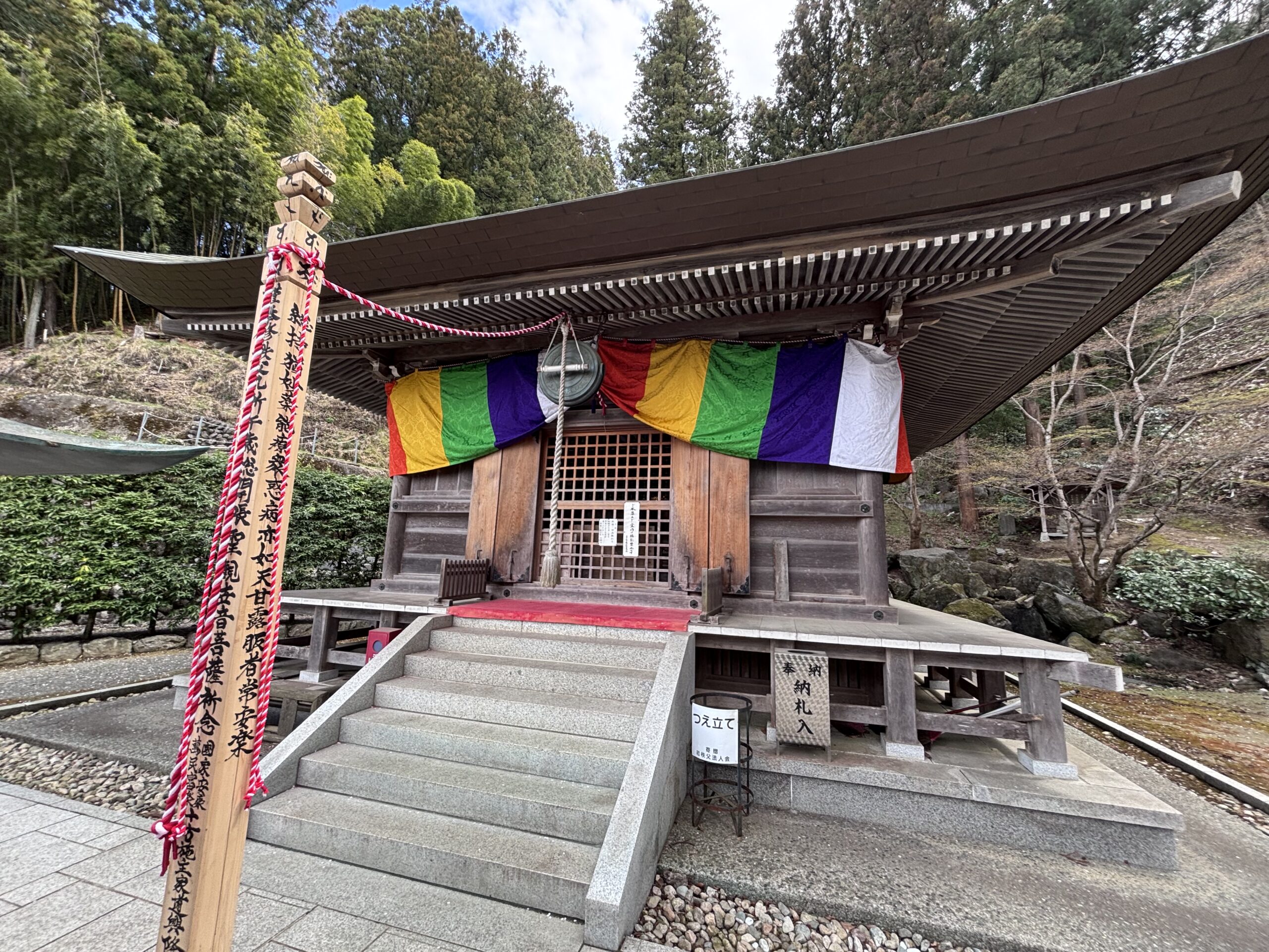 五色幕のかかった本堂。山の麓の緑豊かな背景の景色によって、荘厳な雰囲気が一層際立ちます。