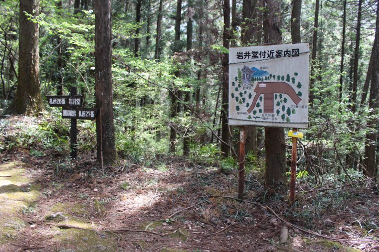 札所26番からは、奥の院岩井堂を経由し、琴平丘陵ハイキングコースをたどると徒歩で約60分かかります。この奥の院岩井堂を経由しなければ10分ほどで到着できますが、いかにも巡礼道らしい山中の石段を登って目指す奥の院岩井堂や、ハイキングコースの途中にある巨大観音像からの秩父盆地の眺めは必見です。
